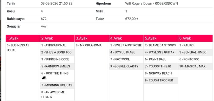 0 Tahminler 03 Şubat 2026 Will Rogers 1 1,4,5,7 8,7,4//2,6//1 2//3,7,4 5 3,8,5,1,2,6,/7 8 672 lira tahmindir. bol şanslar.