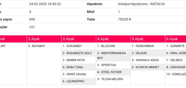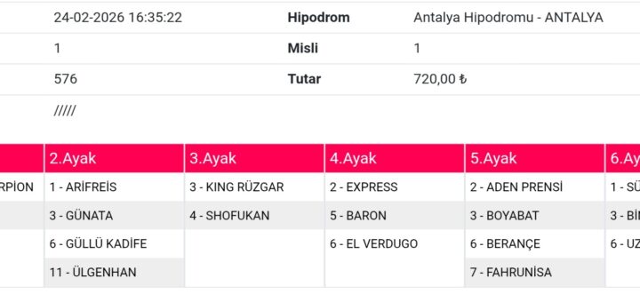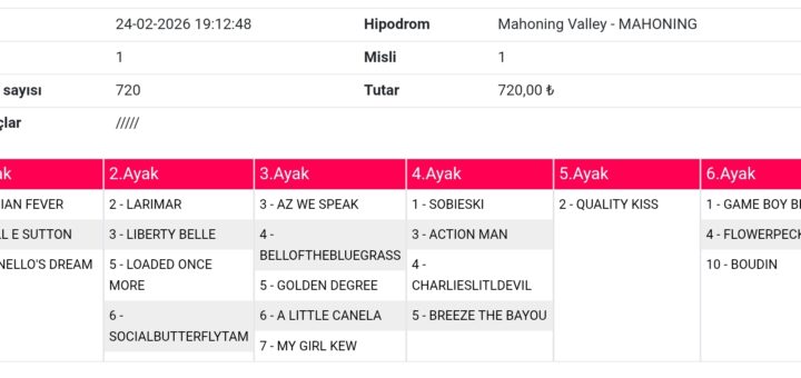 0 Tahminler 24 Şubat 2026 Mahoney 2 1-3-4-5-6 2 1-2-4-10 6-7 4 3-5-7-10 160 liradır. Not: Sitemizde ‘Köftehor’ mahlasıyla nam salmış, Sevgili Zeynel arkadaşımın yatırmış olduğu kupondur. Bol şansları olsun. Umarım tutar.