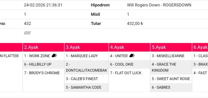 0 Tahminler 24 Şubat 2026 Wıll Rogers 1 Zeynel’in kuponudur. 3 1-6-7 1-2-3 4-6-7 1-3-4-5-6 3 180 lira.